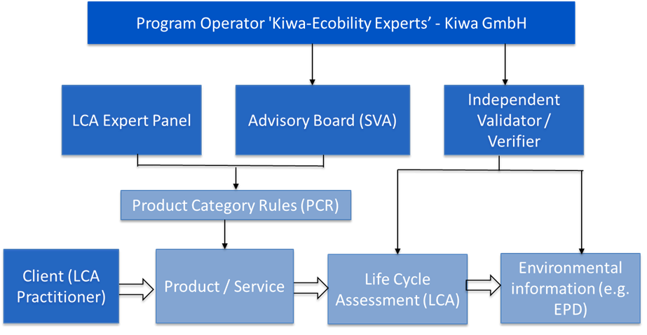 The program operator, Kiwa-EE develops and publishes the necessary product category rules (PCRs) for publication in cooperation with an advisory board (SVA). The experts of Kiwa Group request the PCRs from the program operator and then prepare a draft of the environmental information (EPD). Kiwa Group commissions the program operator to carry out an external validation/verification of the environmental information (e.g. EPD) on behalf of the customer. The program operator orders an independent external verifier to verify the environmental information (EPD). The independent external verifier checks the environmental information (EPD) data, consults the experts of Kiwa Group and prepares a validation/verification report. The validation/verification decision is positive if the environmental information (EPD) withstands the formal and substantive examination. The validation/verification decision is negative if the environmental information (EPD) does not meet all the requirements for external validation/verification. The verification report informs the program operator about deviations and corrective measures. If the external verification is positive, the program operator publishes the environmental information (EPD) in the Ökobaudat. After completion, the customer receives the validation/verification report.