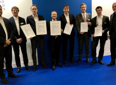 Photo: First certificates handed over to Wavin, REHAU and Uponor. From left to right: Dragan Jovanov and Ronald Karel (Kiwa), Jan Elenbaas (Wavin Group B.V.), Jan Molterer and Horst Stimmelmayr (REHAU AG + Co), Joachim Rau (DVGW CERT GmbH), Markus Bohl (Uponor GmbH) and Volker Meyer (European Drinking Water (EDW).