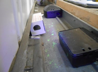 The photo above vividly demonstrates the avoidance of bait stations and trapping boxes by mice, which we observed when we tested the efficacy of these against remote rodent monitoring devices. The green footprints are actually a non-toxic dust which fluoresces under UV light, and highlight that mice were running around and over devices that had been placed to control them.