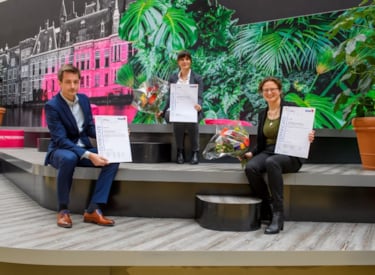 Photo: Kiwa’s André Schoonhoven presents the ISO 9001, ISO 14001 and ISO 27001 certificates to Aynur Balkan and Alie Rozendal of T-Mobile Netherlands.